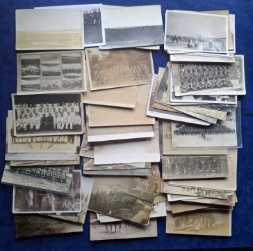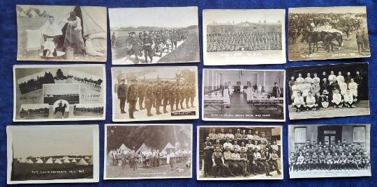 Postcards, Military, 100 cards to include portraits, groups, barracks, ablutions, sports teams, horse lines, Empire Stores Larkhill Camp, Public Schools OTC Camp Salisbury Plain, dining room Peel House, 12th Middlesex cookhouse Parkgate Camp 1914, Aldershot and much more ( gen gd)