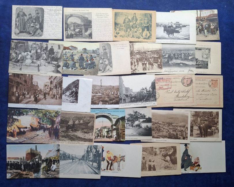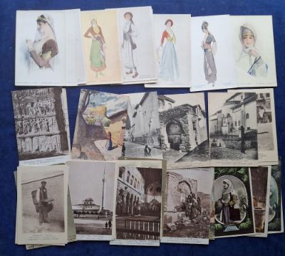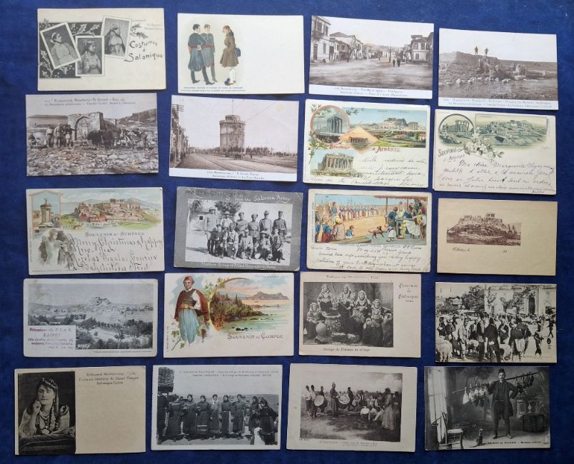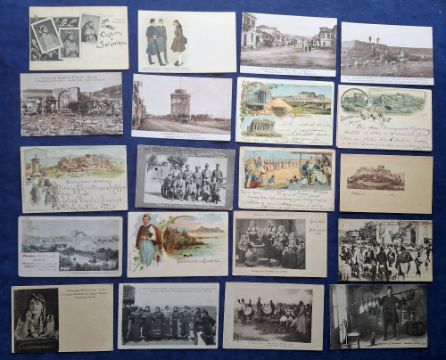 Postcards, Salonica and Athens and other areas of Greece, 100+ cards featuring tabour players, dancing, sheep market, costumes, street porter, coffee boy, pottery dealer, milk seller, butcher, laundry women, curiosity dealer, ice vendor etc(gd)