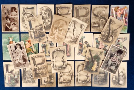 Postcards, Alphabet cards, approx. 60, and 2 number cards, flowers, cherubs and pretty ladies (gen gd)