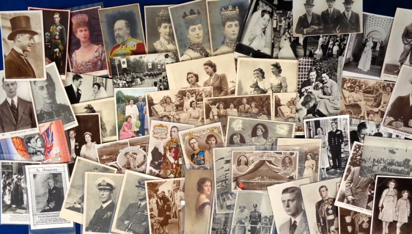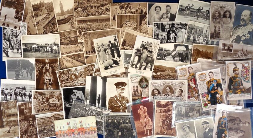 Postcards, British Royalty, 110+ cards to include Edward VIII, Queen Elizabeth, George VI, Princess Elizabeth, Princesses Elizabeth and Margaret riding an elephant, The Braemar Gathering, Royal visits, Princess Margaret, Queen Alexandra, Edward VII (gen gd)