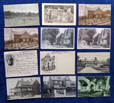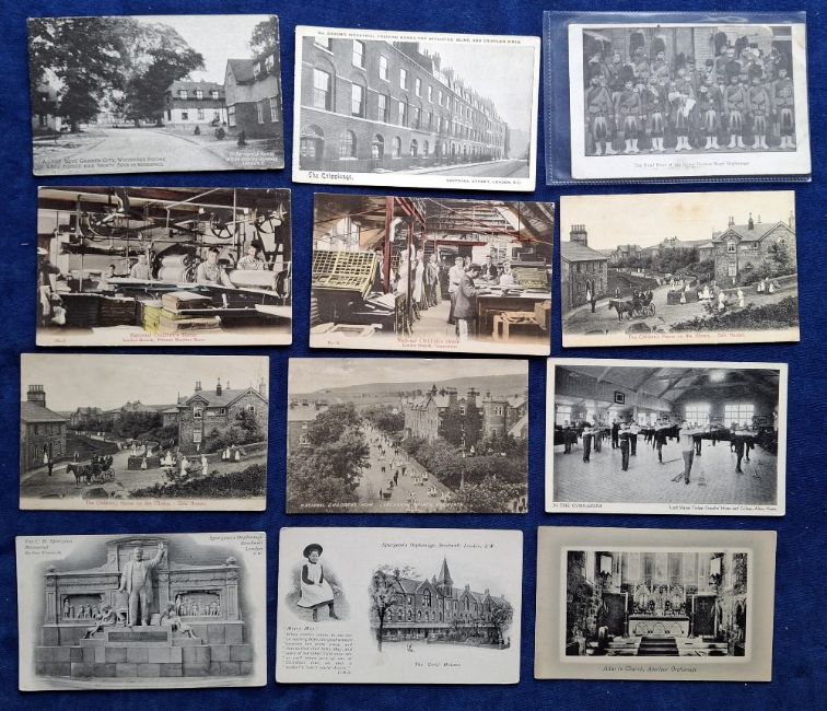 Postcards, Social History, Orphanages, approx 100 cards showing many orphanages and children's homes to include Aberlour, Spurgeon's, Lord Mayor Trewloar Cripples' Home, Bullingham Children's Home, National Children's Home Lancashire, St Monica's Folkestone, John Groom's Orphanage & Cripleage, Mullers Orphanage Bristol, Barnardos Homes, Railway Orphanage Derby and many more (gen gd)