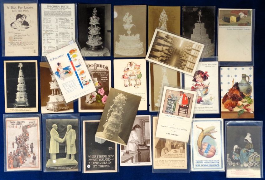 Postcards, Food, 65+ cards to include advertising ( Foster Clark's Jellies, Feathery Flake Flour, Gas Works, Symington's, National Milk Publicity Council), wedding cakes, pasties, comic etc (gd)