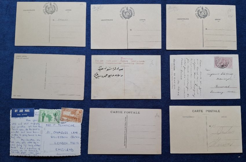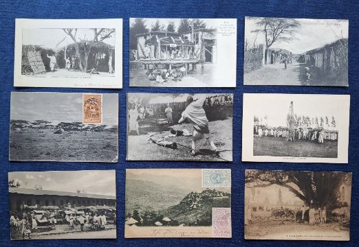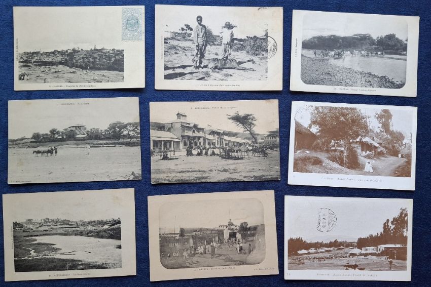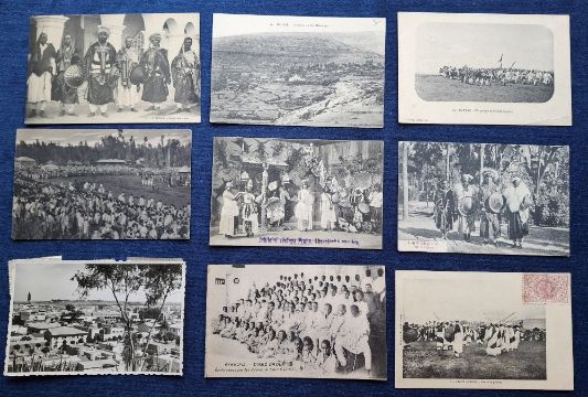 Postcards, Ethiopia, 27 cards mainly views / social history, including Street Scenes at Dire Daoua, Harrar & Addis Abeba, Military Chiefs Harrar, Addis Abeba Street Execution, Dire Dawa Prison, Ethiopia Trade Stand Vienna Exhibition 1910, etc (2 cards postally used, some others written on the back mostly unused) (fair / mainly gd)