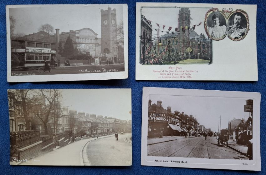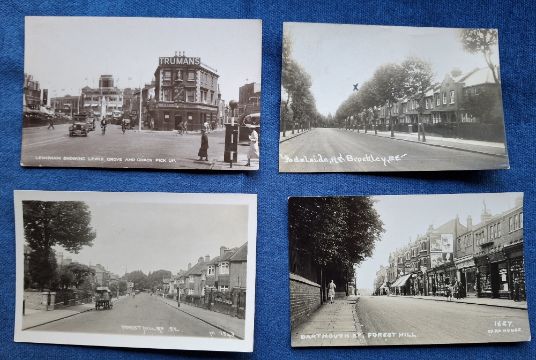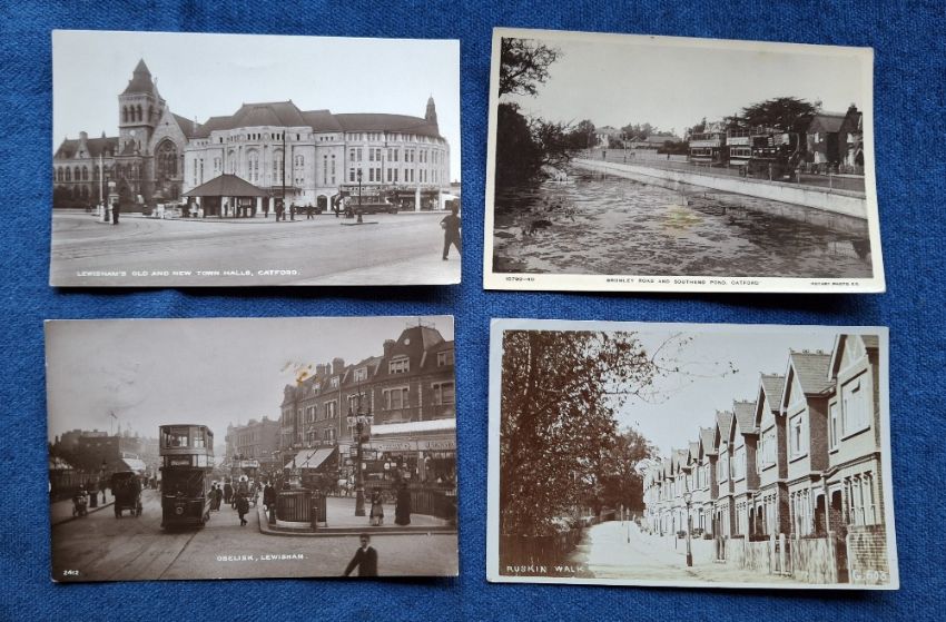 Postcards, London Suburbs, good selection 17 cards with RP's of Charlton Lane (Perkins), Town Hall Catford, Bromley Rd and Pond Catford, Lewisham's old & new Town Hall, Ruskin Walk, Obelisk Lewisham, Bostal Woods, Lewis Grove & Coach Pick up Lewisham, Adelaide Rd Brockley, Forest Hill Rd (Johns), Dartmouth Rd Forest Hill, Romford Rd Forest Gate etc (gen gd)