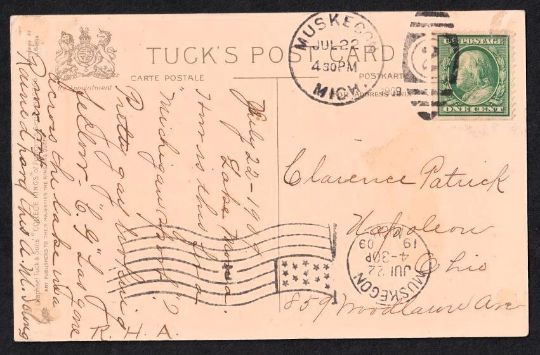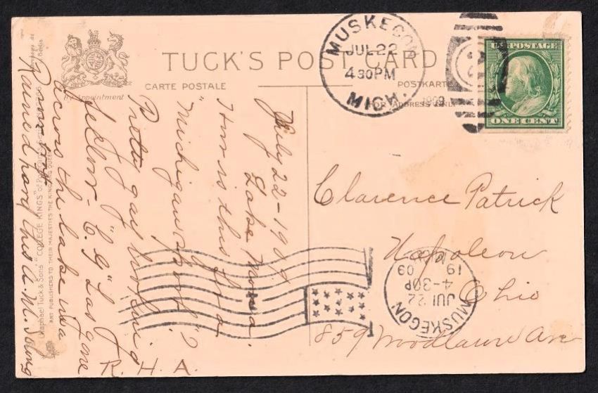 Postcard, Sport, a Tuck's 'College Kings' Series card by F. Earl Christy featuring Michigan King of clubs. Posted in Muskegon Michigan on July 22nd 1909 (gd)