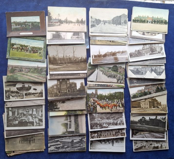 Postcards, Military and Aldershot, 150+ cards showing camps, hospitals, barracks, field stores, children's home, Command Headquarters, Church Parades, 'Miss Daniell's Soldier's Home, Wrench cards etc (gen gd)