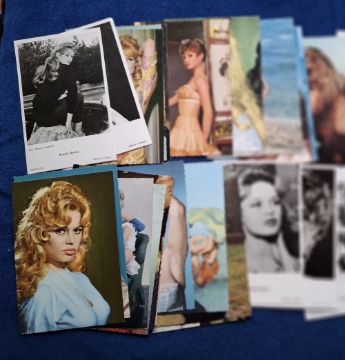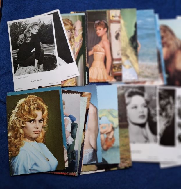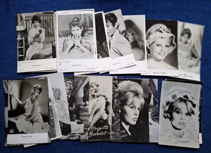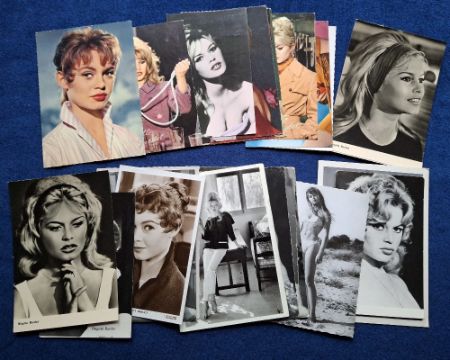 Postcards, Cinema, over 75 postcards all featuring Brigitte Bardot mostly around the 1960's era, majority black & white photographic, some coloured. Mainly unused, but a few written on the back (gen gd)