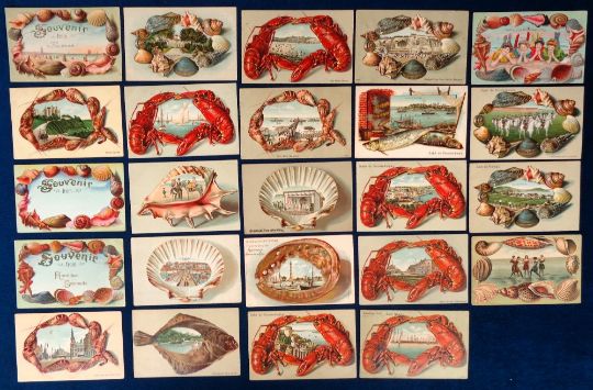 Postcards, Shells, Fish and Crustacea border souvenir cards, 48 cards all embossed featuring UK, European and USA resorts, Pierrots, fairground ride, Brighton Aquarium, Hotels, Piers, Docks, Bathing Huts, Shops, Boats etc (gd/vg)