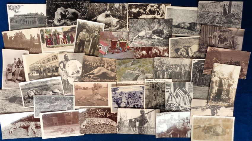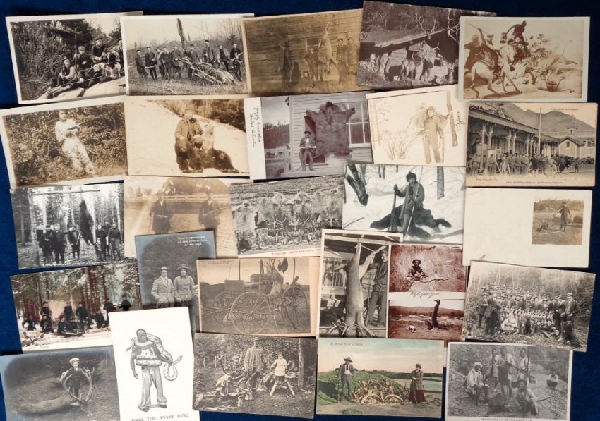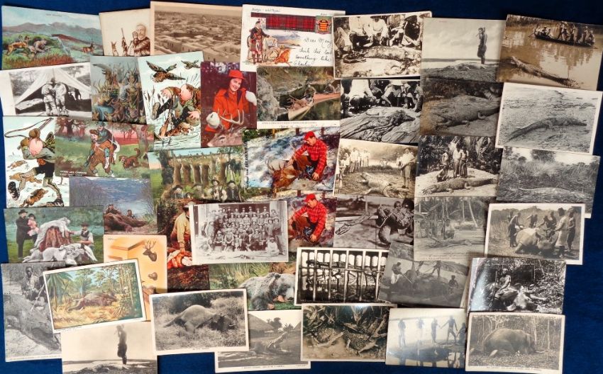 Postcards, Animal Hunting, approx. 120 cards, RPs, printed and artist drawn, depicting hunting to include hyena, giraffe, trap, crocodiles, snakes, gorilla, deer, geese, caribou, bears, leopards, lions and more. 1 Military 'The Devons 1st Catch Ferozepore (gd)