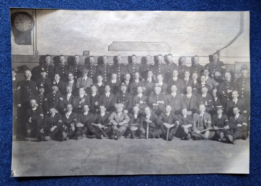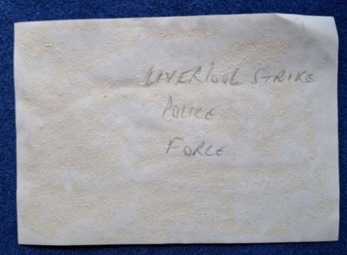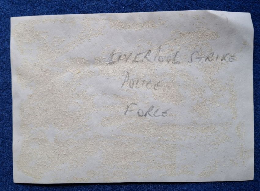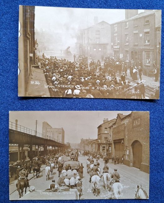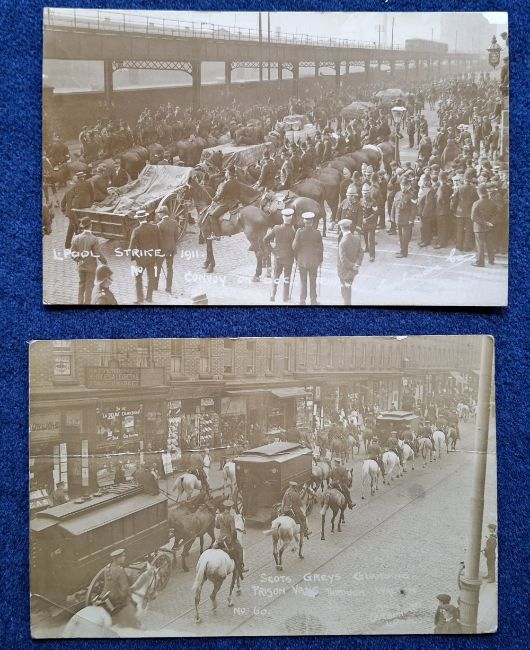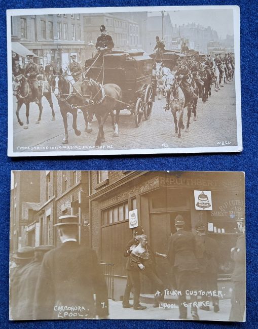 Postcards, Social History, Liverpool Strike 1911, 8 RP cards, Carbonara Published (5) #1 Convoy in Dock, #7 Tough Customer, #36 Fire in Standish St, #56 Convoy on Dock ST, #60 Scotch Greys Guarding Prison Vans plus W. & Co (3), Guarding Prison Vans, Arrests, Military Guarding Vans, sold with a printed paper cut out stated to be Liverpool Strike Police Force Group Photo (postcard front generally gd, some degree of fading, backs all have paper residue on them from having been stuck in an album at some point, Carbonara no.60 is creased)