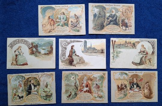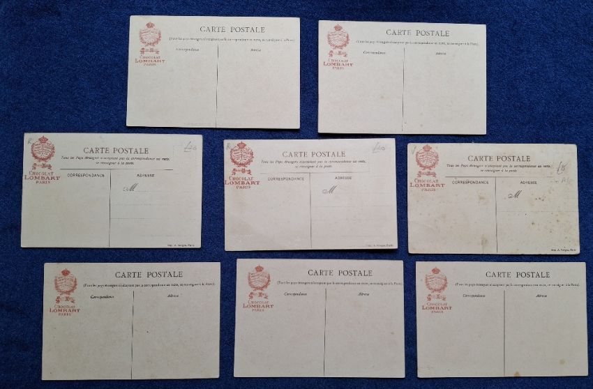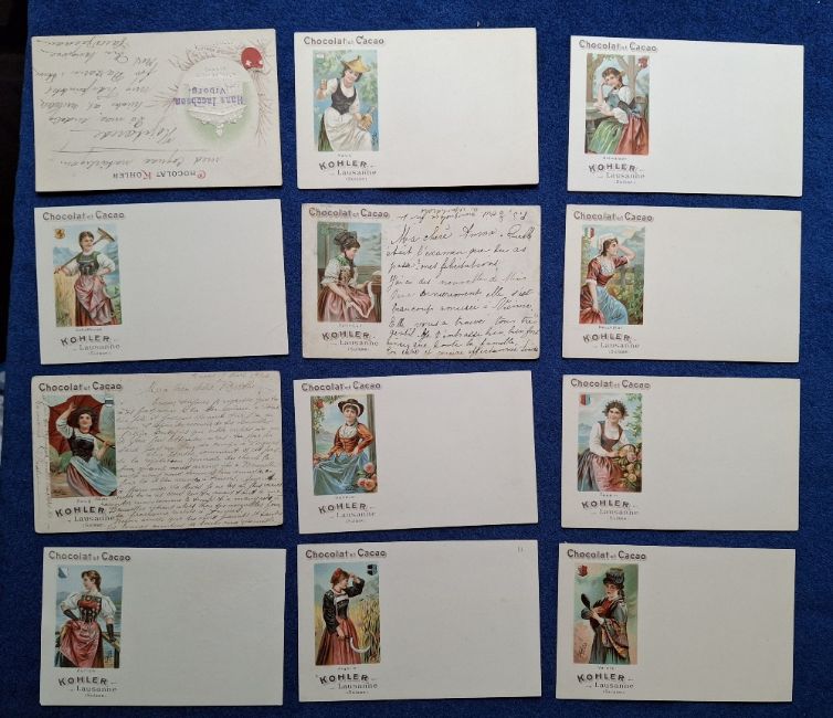 Postcards, Advertising, 28 cards advertising various French Chocolate firms, Chocolat Louit Navires (Navy) Anciennes & Modernes (6), Kohler (12, including 11 Regional Swiss Costumes), Lombart (10 including Dentelles (3), Poets & Romanciers (5), Factory / Rail adverts (2)) (mostly unused a few postally used or written on, otherwise a few fair, mainly gd)