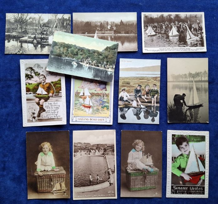 Postcards, Social History, Pond Yachts, 37 cards showing an assortment of model yachts, most afloat on ponds or sea including the 1913 Model Yacht Regatta at Felixstowe, a few greetings, Sheffield, Littleheath, Swansea, Bexhill, London, Bournemouth, Southampton, Littlehampton and more (gen gd)