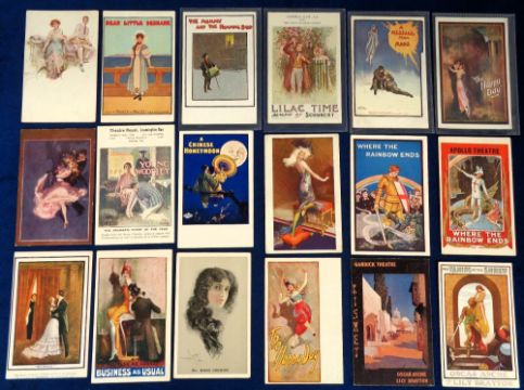 Postcards, Theatre Advertising, a selection of 50+ cards to include Tantalizing Tommy, Charles Hawtrey in Ambrose Appleton's Adventure, The Island King, Bright Eyes, Autumn Manoeuvres, The Girl In The Taxi, Kismet and many more. Many theatres represented (gen gd)