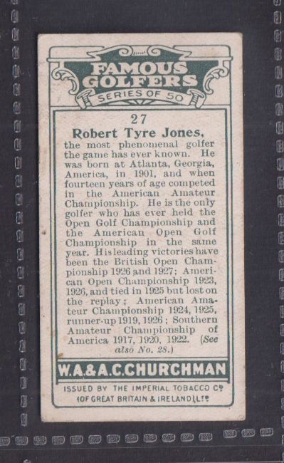 Cigarette card, Churchman, Famous Golfers (standard size), type card, no.27 Bobby Jones type card (slight toning / foxing marks, about gd)