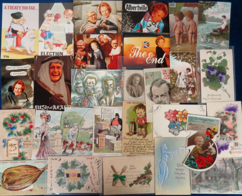 Postcards, a mixed subject collection of approx. 105 cards, with 35 political, mostly Thatcher, and 70 vintage novelty cards with pullouts (inc. Wain), glass eyes, appliqué, hand drawn, HTL/transparencies, numbers, leather, embossed, panel, puzzle, silk, teddy, squeaker etc. Nice mix (mixed condition)
