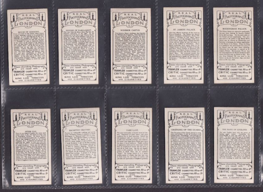 Cigarette cards, 3 sets; Pattreiouex Real Photographs of London (standard sized, 54 cards), CWS Boy Scout Badges, Morris Wireless Series (gd)
