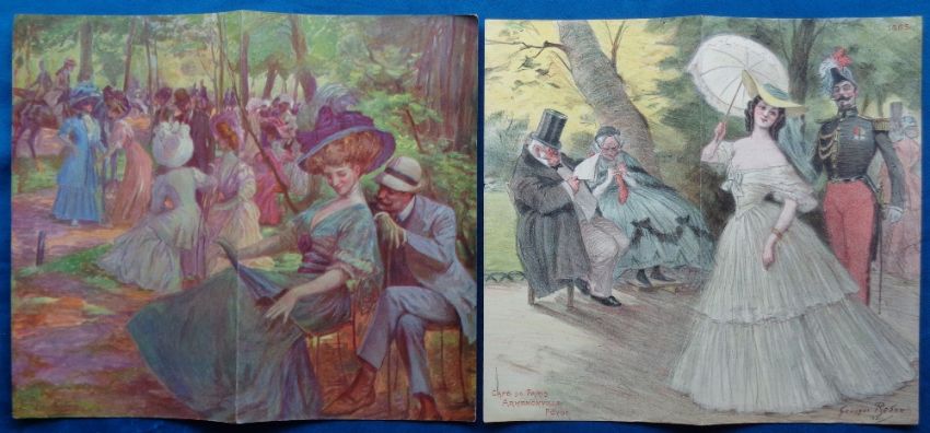 Ephemera, 13 attractive menus from the Café de Paris (1905-10) illustrated by Georges Redon showing life in France during various periods (some with fragile 'spines' o/w gd)