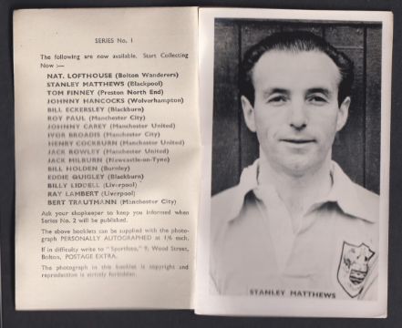 Trade issues, Sportsfoto, Famous Footballers, 9 postcard size photographic cards, issued in individual folders with 'Interesting Facts about Football' to backs, scarce, Ivor Broadis, Johnny Carey, Bill Eckersley, Tom Finney, Johnny Hancocks, Ray Lambert, Billy Liddell, Stanley Matthews and Jack Rowley (gd) (1)