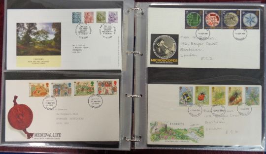 Stamps, GB QEII first day covers in 3 albums to include 2002 Astronomy Miniature sheet, 2003 Wilding Miniature Sheet and Machin high values and an album of Isle of Man. (150+)