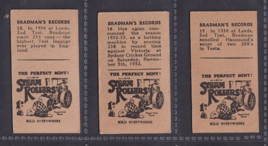 Trade cards, Allen's (Australia) Bradman's Records, series I brown fronts, 3 cards numbers 17 (in drive), 18 (trophy left) & 15 (no cap on head horizontal) (some slight toning on fronts, about gd)