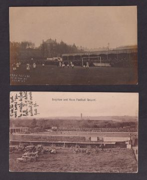 Football postcards, Brighton & Hove Albion FC, one b/w photographic card showing match action by Seaman & Son of Brighton (unused, gd) sold with a sepia printed card showing view of Brighton & Hove Football Ground with match action in distance (postally used & with some writing to face, gen gd)