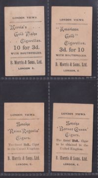 Cigarette cards, Morris, London Views, four type cards each with different back, Westminster Abbey (American Gold), The Clock Tower Westminster (Gold Flake), The Royal Exchange (Borneo Queen) and St. Pauls Ludgate Hill (Reina Regenta) (all with slight toning, gd) (4)