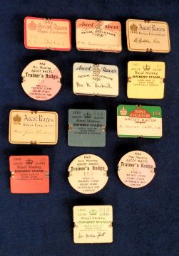 Horse Racing badges, a collection of 13 badges inc. six different Royal Enclosure badges with brass fittings for 1939 (x2), 1950 (x2), 1951 & 1952 plus seven Owners & Trainer badges from the 1960's/70's (mostly gd/vg) (13)
