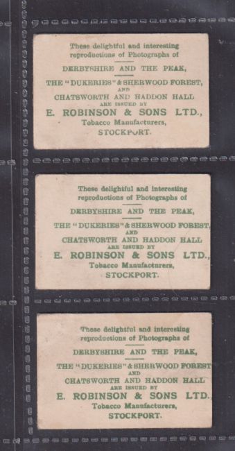 Cigarette cards, E Robinson & Son, Derbyshire & The Peaks, 3 type cards 'Thoresby House', 'State Bedroom Haddon Hall', 'Picture Gallery Welbeck Abbey' (Thoresby and Haddon Hall cards off centre printed otherwise fair)
