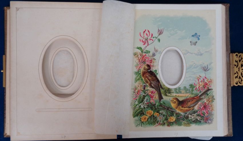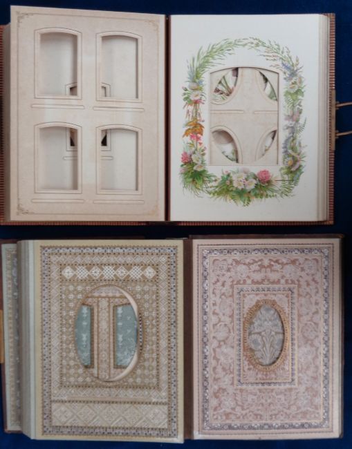 Ephemera, Victorian Scrap Books, 3 empty but unusual albums to comprise 1 red leather with gilt tooling, alternate pages beautifully illustrated with flowers, 1 brown leather with outstanding and ornate clasp, alternate pages decorated with bird illustrations (gd but spine and internal pages not tight), 1 brown leather album with every page illustrate with a different type of named lace (spine and clasp missing, pages gd)