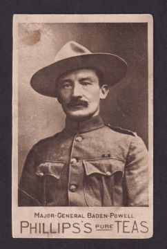 Trade card, Phillips's Tea, Major General Baden-Powell, large advertising card with image of Baden-Powell, back states 'The British Army likes Phillips's Pure Tea', 100mm x 63mm (slightly marked, gen. gd) (1)