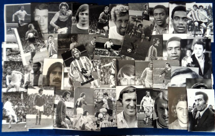 Football press photographs, a collection of 80+ black & white press photos, 1970's, all showing footballers with the initials C, portraits, action, training shots etc, mostly approx. 160mm x 120mm inc. Johan Cruyff, Alan Clarke, Laurie Cunningham, Ray Clemence, Martin Chivers, Ralph Coates, Steve Coppell, Tony Currie, Mick Channon, Jack Charlton etc, mainly identified to backs (several with rough cut edges, some slight marks, gen. gd)