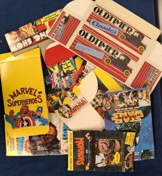 Trade cards, Selection of over 45 Retail Boxes from various issuers, all flattened (no packets or cards) some better titles noted including Donruss Sgt Pepper, Monty Gum Kojak, Monty World Money, Topps Star Trek, Topps Star Wars, Topps Garbage Pail Kids 5, Donruss Rock Stars, Monty Gum TV Hits, etc, some duplication (mixed condition fair/gd some better than others)