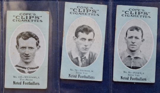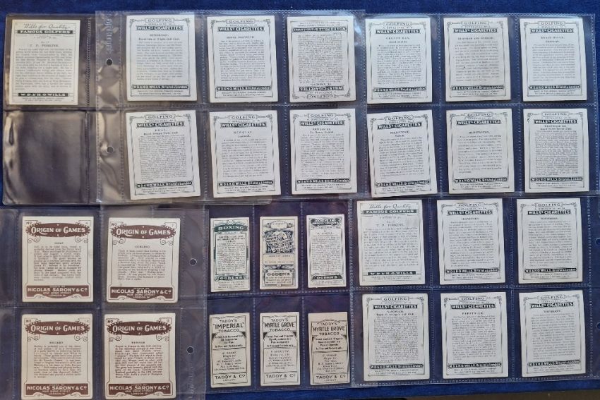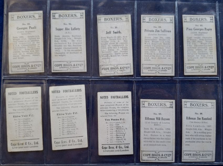 Cigarette cards, Sporting selection, 89 cards including Cope Boxers (7), Cope Clips Footballers (3, 120 backs 2 Ebbw Vale & 1 Ton Pentre subjects), Taddy Jockeys (3), Sarony Origin of Games large (4, including Golf), Wills Golfing (16) etc (fair/gd many about gd)