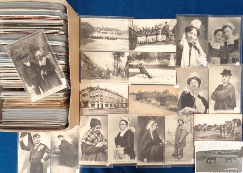 Postcards, France, a mixed age collection of approx. 600 French cards, with a good selection of towns, villages, street scenes, markets, rail stations, ethnic, costume, rural (farming etc), a few military, floods, transport, buildings etc (mixed condition)