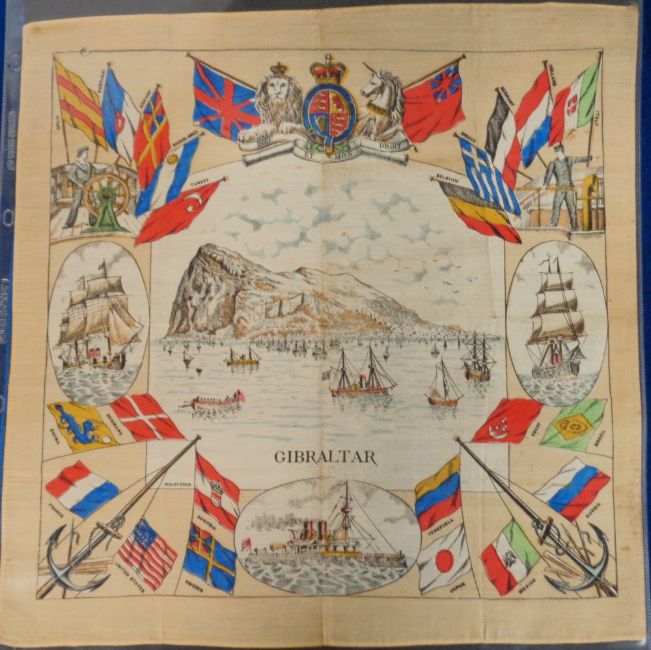 Militaria, 2 silk squares to comprise 1 of Gibraltar with a central panel showing the rock surrounded by boats and ships and a border depicting Naval scenes and flags (gd but fragile with some fold wear and foxing), the other showing a central scene of Tanger with a border showing local life scenes (split across central fold, some foxing)