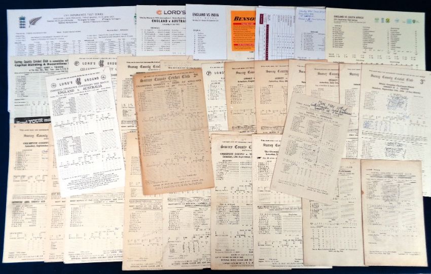 Cricket scorecards, a collection of 35+ scorecards, mostly 1950's onwards but including Surrey v Rest of England 1933, also Notts. V Australia 1948, Surrey v Australians 1953, Yorkshire v Rest of England 1960, England v Australia 1980 etc (many with annotations, a couple with ph, fair/gd)
