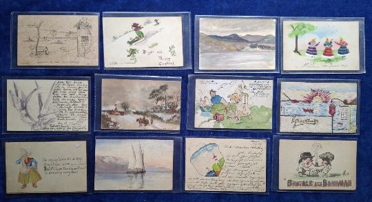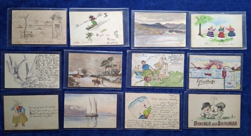 Postcards, Art, 66 cards all Hand Drawn examples, some coloured painted, others black & White ink drawings, many different styles & subjects covered, some postally used others unused. Nearly all have postcard backs, a couple with plain backs noted (fair/gd)