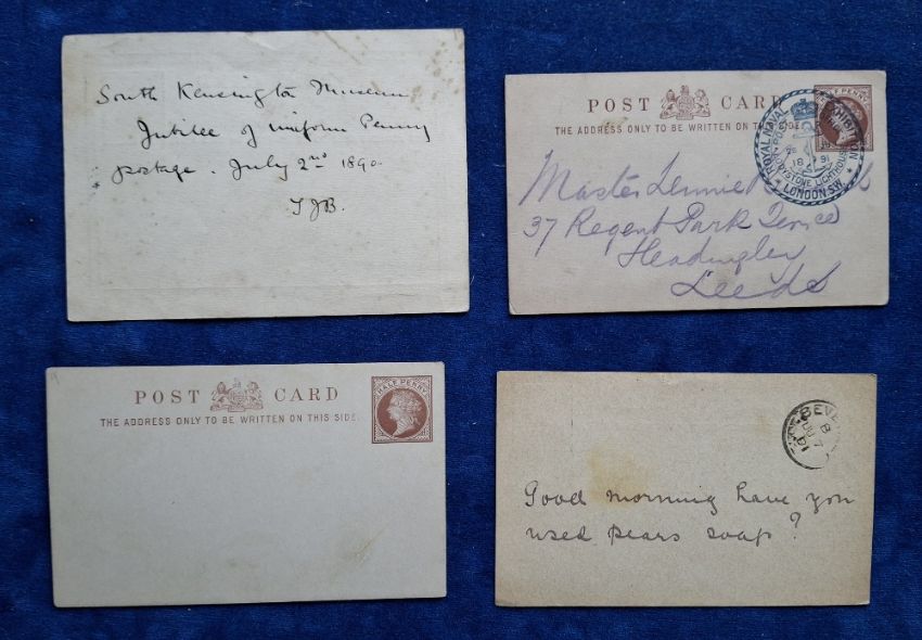 Postcards, Postal History, 11 mainly postal stationery card; 2 cards for the Royal Naval Exhibition 1891 both with official cachets, one with Eddystone Lighthouse on reverse. Gardening & Forestry Exhibition 1893 illustrated but unused. 8 cards and envelopes of the Penny Post Jubilee 1840-1890; Guildhall cachet and explanatory letter dated 19 May 1890, used postal stationery card with cachet dated 2 July 1890, official sealed envelope for Penny Post (used), used card without cachet but with 2d postage due also dated 2 July 1890, another used & stamped 1d Lilac dated 22 July 1897 & 3 not postally used (some foxing, fair to gen gd)