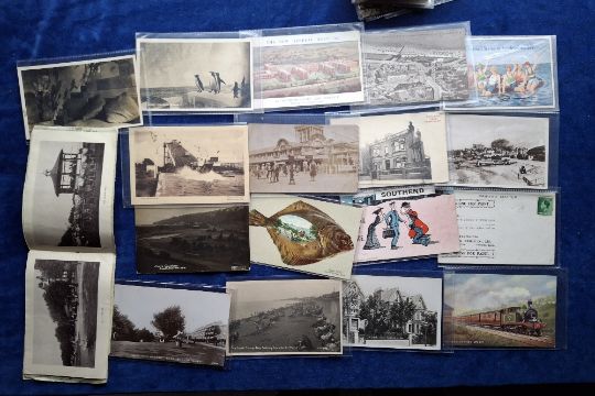 Postcards, Essex, Southend on Sea / Prittlewell, over 100 cards including HRH Duke of York Opening Priory Park Prittlewell RP, Pier Trams, Harton Scenic Railway, Hospital Carnival RP, Our Worker Women's Excursion to Southend on Sea, 3 printed view cards with Squier & Son Suit retailers Southend Advertising backs (non p/c issue) etc (gen gd a few fair)