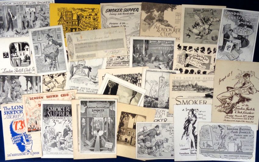 Ephemera, London Sketch Club, 46 invitations/flyers to the smoking concerts held at the London Sketch Club (1915-1952 inc. some war years). Most with amusing sketches, some by well known artists to include Sidney Ferris (signed), George Studdy, CD Ward, Winslade, Harry Dixon, Harold Earnshaw etc. Together with a cheque for 1914/15 subscription to the club (gd)