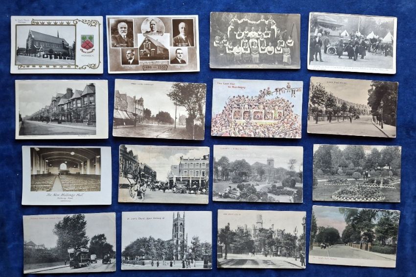 Postcards, London Suburbs, over 80 cards mainly North / North West London including RP's of Cavendish Rd Brondesbury, Plympton Rd Kilburn, Brondesbury Rd Kilburn, Brondesbury Arms Kilburn, Christ Church Ave Kilburn, Ashmore Rd Kilburn, Salisbury Rd Kilburn, Hampden Rd Floods Hornsey, Shop Hornsey Rd, Brass Band, Hornsey Rise, Elyne Rd Harringay, Nags Head Holloway Rd, Spotted Dog Neasden, Motor Car Coachwork Co Kentish Town, a few good printed street scenes (mixed condition gen gd)