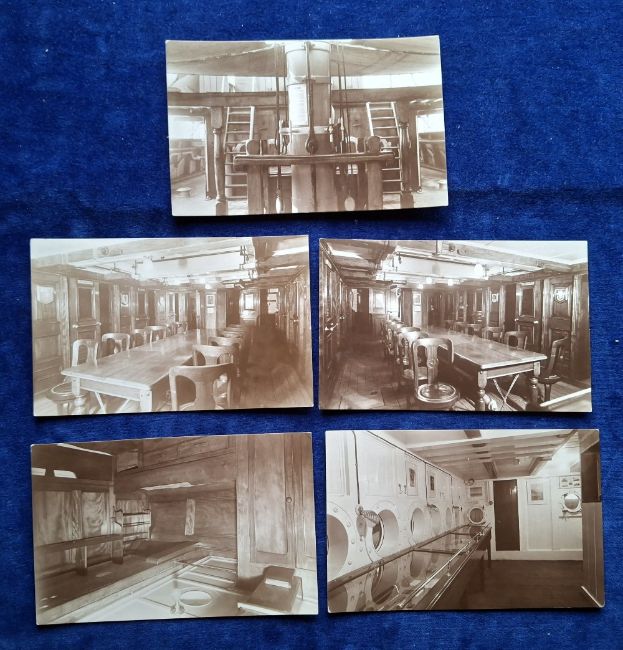 Postcards, Polar Exploration, 5 RP's of the Interior Rooms of Scott's Ship RRS Discovery, a barque rigged auxiliary steamship launch in 1901. The RP's show Observation Room (2), Bedroom, Ward Room (2) (gd/vg)