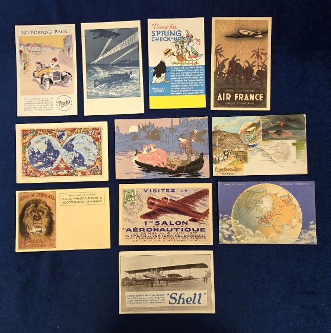 Postcards, Advertising, Transport and Travel, 11 cards to include Pratts, Shell, New Departure Coaster Brake, Thos Cook, Red Star Line, Air France (2), Imperial Government Railways of Japan and more (gen gd)