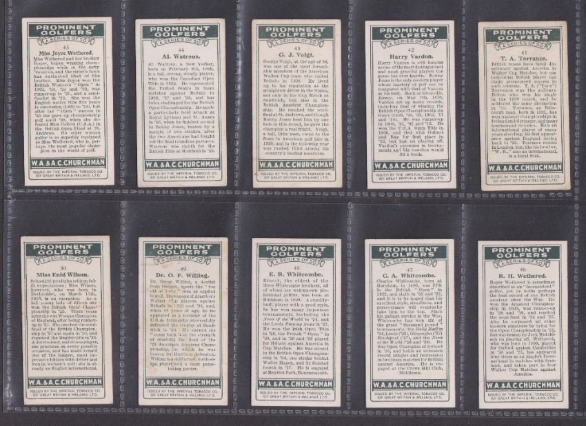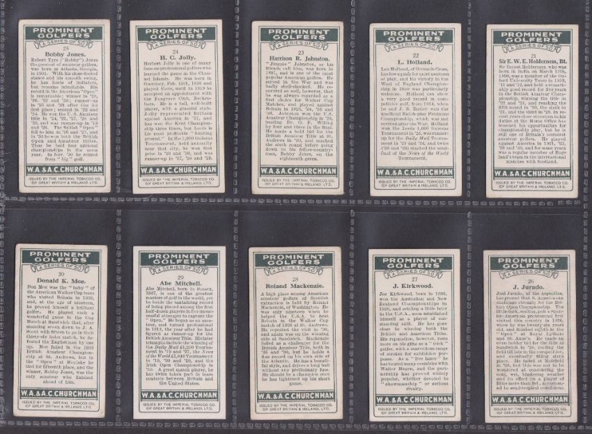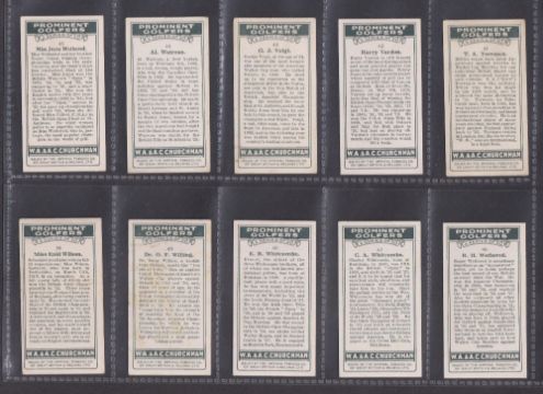 Cigarette cards, Churchman Prominent Golfers standard sized (set 50 cards) including Bobby Jones (near gd), Walter Hagen, Gene Sarazen (near vg) etc (a few fair/ near gd, gen gd/vg)