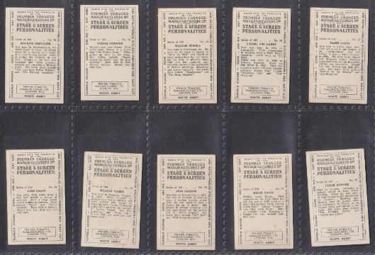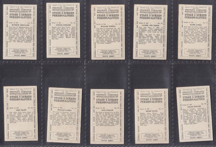 Cigarette cards, Premier Tobacco Co Stage & Screen Personalities (grey) (set 100 cards) including Laurel & Hardy (a few with light foxing, gen gd/ better)