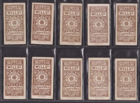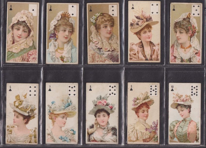 Cigarette cards, Wills Beauties Playing card insets (brown scroll backs) (set 52 cards) 3 cards; 10 Diamonds, 10 Hearts, Ace Hearts are the alternative subject versions (mixed condition, vast majority in the fair/near gd range, a few are gd)
