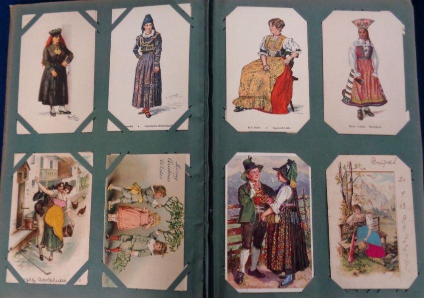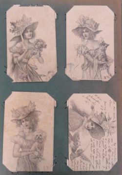 Postcards, a vintage album containing 240+ assorted cards to include glamour, children, silhouette, fashion, romance, babies, Boileau, Valentines and more. An attractive selection (gd)