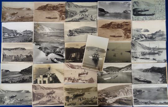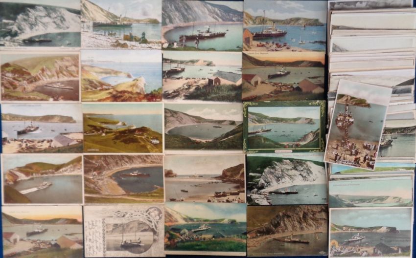 Postcards, Dorset, a comprehensive collection of over 100+ cards of Lulworth Cove, mostly showing the cove with attendant paddle steamer. Includes A.R Quinton (3), LLs Lulworth Cove nos. 30, 31 & 32. Also Weymouth no. 30 & 32. Paddle steamers mostly PS Victoria, Empress and Consul. Also aerial views, disembarking passengers, Cosens & Co advert for pleasure steamers (mainly gd)