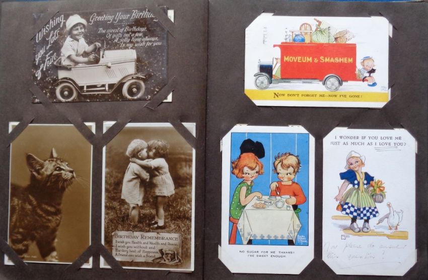 Postcards, a mixed collection of over 200 general UK topographical and subject cards in vintage album, with a few good RPs inc. Western Rd Cork, Elliott Rd Hendon, Sun St Hitchin (printed). Artists include Paterson, Ainsley, McGill, Attwell, Tarrant, Cooper, Outhwaite. Themes include cats, dogs, greetings, comic, golf, chips, black cats, seaside, children (mixed condition)
