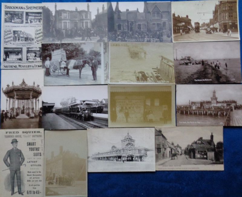 Postcards, Essex, a Southend selection of 15 cards with RPs of houses in West Rd and London Rd damaged in air raid (2), decorated delivery cart, broken pier, station interior with train, bandstand, station bookstall (faded), Broadway. Also printed cards of Fred Squier (advert) 'Smart Youth's Suits', shop front montage for Brockman & Shepherd butcher (mixed condition)